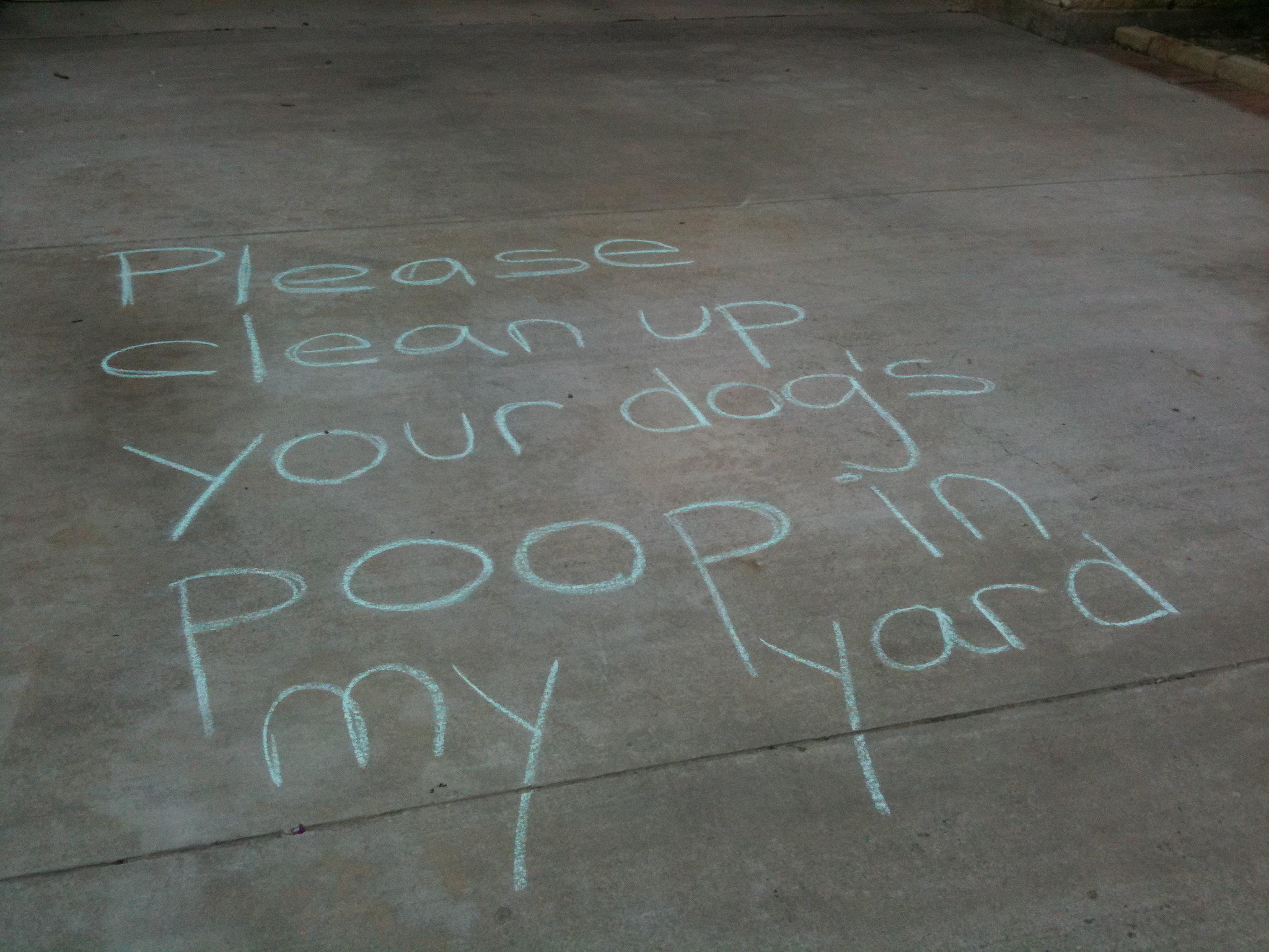 I had a neighbor whose dog lived for the day it was let out of its fenced-in, poop-filled yard so it could take a massive dump in my yard (these are small yards, and close houses). Not the dog’s fault – its own yard was filthy. But this was during the period of time my daughter was at the learning-to-walk age, and it made me crazy. Once I managed to stick my head out the window and catch the dog in the act while its owner stood there: “You’re going to clean that up, right?” I said, sweetly. He at least had the grace to blush crimson.